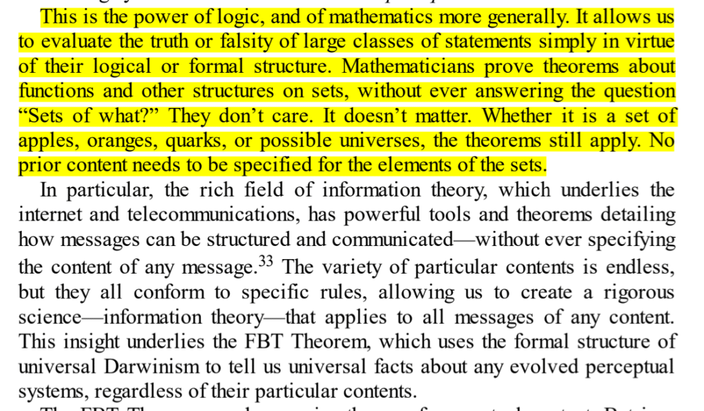 Em particular, o rico campo da teoria da informação, que fundamenta a internet e as telecomunicações, possui ferramentas e teoremas poderosos que detalham como as mensagens podem ser estruturadas e comunicadas — sem nunca especificar o conteúdo de nenhuma mensagem. A variedade de conteúdos específicos é infinita, mas todos obedecem a regras específicas, permitindo-nos criar uma ciência rigorosa — a teoria da informação — que se aplica a todas as mensagens de qualquer conteúdo. Essa percepção fundamenta o Teorema FBT, que usa a estrutura formal do darwinismo universal para nos contar fatos universais sobre quaisquer sistemas perceptuais evoluídos, independentemente de seus conteúdos particulares.
